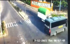 Peristiwa terjadi sekira pukul 07.00 pagi di persimpangan lampu merah , kuat nya tabrakan antara mobil truk dan mobil bus Polda Jambi mengakibatkan 1 siswa meninggal dunia di TKP dan belasan orang lain nya Luka luka.