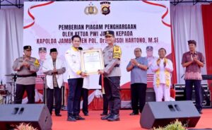 Kali ini, Kapolda Jambi Irjen Pol Drs Rusdi Hartono diberikan penghargaan oleh Ketua PWI Kota Jambi Irwansyah disela-sela Apel Pergeseran Pasukan dalam rangka pengamanan Pemilu.
