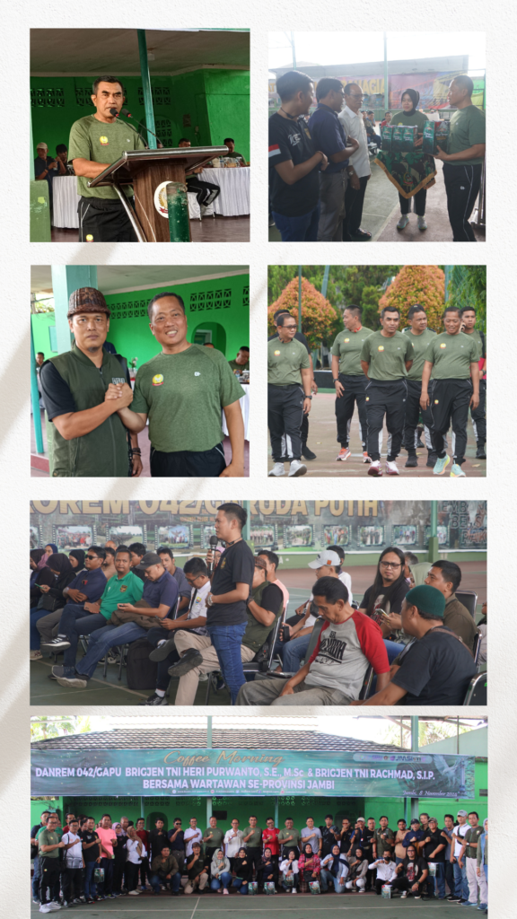 JAMBIEKSPOSE.COM | JAMBI — Guna memperat tali silaturahmi, meningkatkan sinergitas dan kerjasama dengan awak media, Komandan Korem 042/Gapu Brigjen TNI Heri Purwanto, S.E., M.Sc., dan Brigjen TNI Rachmad., S.I.P gelar kegiatan Coffee Morning bersama awak Media, Elektronik, Cetak dan Online mitra Korem, bertempat dilapangan Tenis / Indoor Makorem 042/Gapu,8 November 2024.