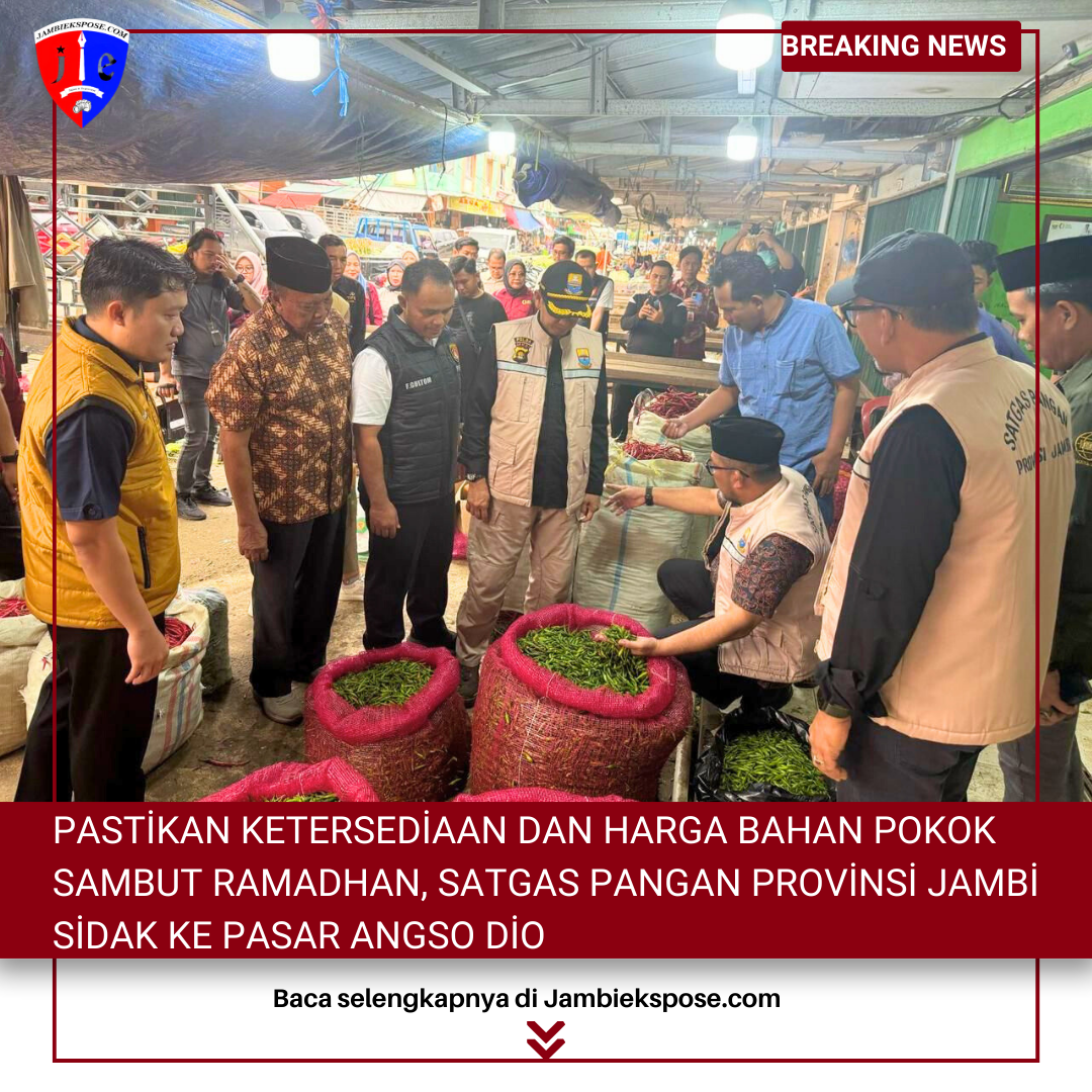 JAMBIEKSPOSE.COM | KOTA JAMBI — Tim Satgas Pangan Provinsi Jambi dan Tim Satgas Pangan Polda Jambi melakukan pemantauan harga dan ketersediaan bahan pokok (BAPOK) di Pasar Tradisional Angso Duo Jambi, Kamis (27/2/2025).