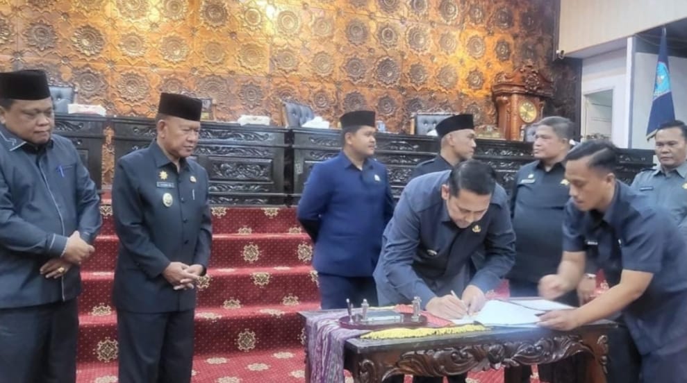Penandatanganan yang disaksikan Wabup Merangin H A Khafidh dan Pj Sekda Merangin Zulhifni tersebut, dilakukan diakhir rapat paripurna DPRD Merangin yang dipimpin Ketua DPRD Merangin M Rivaldi dan dihadiri 24 orang dari 35 orang Dewan.
