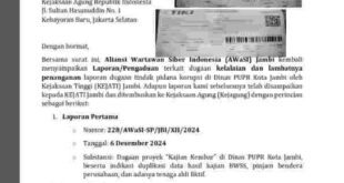 Jambi, 10 Februari 2025 – Semakin kuatnya dugaan terjadinya proyek duplikasi di lingkungan Dinas PUPR Kota Jambi membuat Aliansi Wartawan Siber Indonesia (AWaSI) Jambi semakin gencar menyuarakan penindakan hukum. Setelah dua kali mengirim laporan kepada Kejaksaan Tinggi (KEJATI) Jambi tanpa respons yang memuaskan, AWaSI Jambi kini resmi melaporkan kasus tersebut …